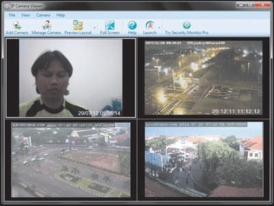 Untuk memantau beberapa lokasi sekaligus dalam satu aplikasi, kamu bisa memanfaatkan IP Camera Viewer. Ia mendukung 4 tampilan dalam satu layar menggunakan 4 sumber yang berbeda. Keempat layar tersebut bisa mengakses dari IP camera dan juga webcam. Karena satu komputer hanya bisa menggunakan 1 webcam, berarti kamu mesti menampilkan 3 layar sisanya melalui IP Camera. Semuanya bisa ditayangkan melalui metode streaming secara bersamaan. Untuk melakukan streaming bareng ini tentu saja dibutuhkan koneksi internet yang stabil.