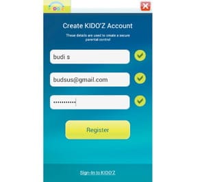 2. Langkah berikutnya, bikinlah akun baru di layanan Kidoz.net. Untuk itu, tap tombol [Create Account]. Masukkan data nama, e-mail, dan password kamu. Setelah itu tap tombol [Register].