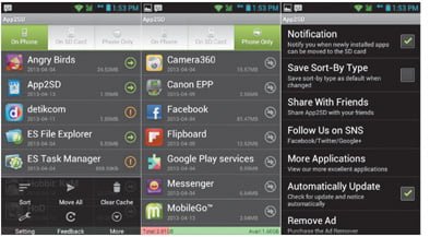 App2SD membuat proses serta pemilahan aplikasi yang bisa dipindah atau tidak menjadi lebih mudah. Perlu diketahui bahwa aplikasi ini bukan bertujuan untuk melakukan backup aplikasi ke kartu memori tapi hanya bertujuan untuk melegakan kapasitas memori internal dengan memindahkan aplikasi yang ada ke kartu memori tambahan.