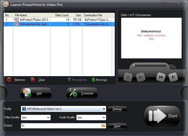 Leawo PowerPoint to Video Pro memungkinkan kamu yang mau mengonversi banyak file PowerPoint sekaligus dalam satu waktu (batch). Kamu tinggal tambahkan lewat tombol “Add” ke daftar proses, tentukan format dan spesifikasi video lalu klik tombol start. Selanjutnya biarkan aplikasi ini yang bekerja.