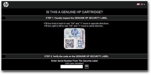 – Kemasannya. Perhatikan kemasan catridge apakah ada loga HP yang asli, cek juga apakah kemasan telah mengalami reproduksi. Selain itu, catridge asli HP selalu menggunakan segel pengaman. Pastikan segel pengaman ini tidak rusak pada kemasan catridge yang kamu beli ya. Selain itu, HP juga selalu menyertakan QRcode pada kemasannya. Dengan memindai QRcode ini dengan ponsel kamu, kamu akan terhubung dengan situs HP yang akan memberitahukan apakah tinta tersebut asli atau tidak. Cara lain adalah dengan mengecek HP Catridge Secure Serial Number yang ada di Security Label. Cek nomer ini di www.hp.com/go/ok.