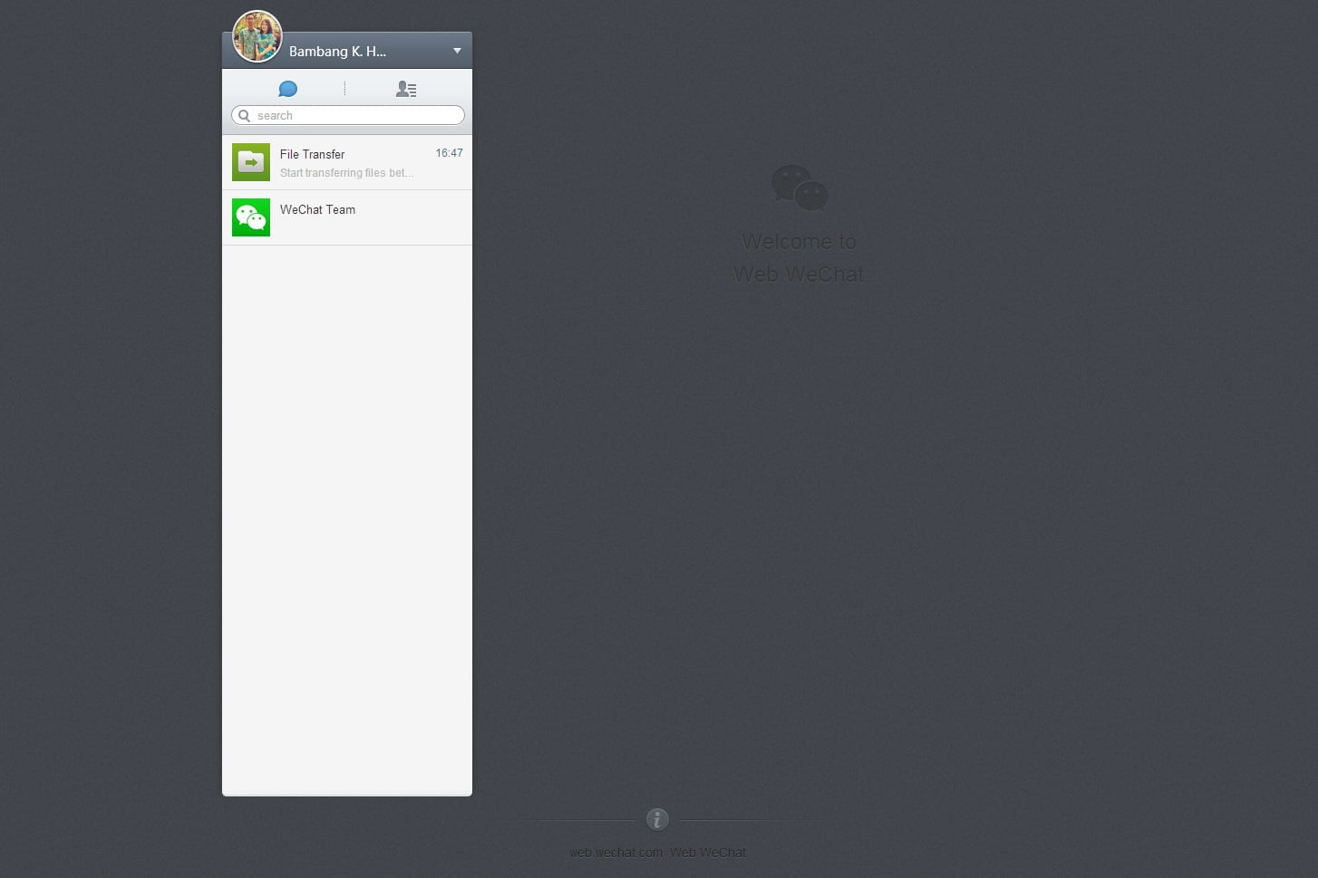 Oiya, kalau kamu mau menggunakan WeChat di PC tapi malas menginstal WeChat untuk PC, kamu bisa melakukannya lewat peramban. Cukup ketikkan web.wechat.com, maka akan keluar QRcode. Pindai QRcode ini dengan WeChat di smartphonemu. Maka kamu bisa langsung chatting lewat peramban, tak perlu repot.