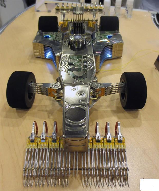Hmm, kamu yang pernah membuka bagian dalam PC pasti mengenali komponen-komponen mobil ini mirip hard disk. Ya benar. Mobil balap ini memang dibuat dari ratusan hard disk.