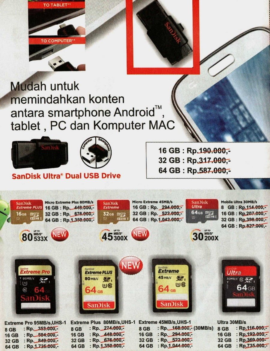 Selain microSD dan SDcard, pangkas harga juga diberikan untuk USB dual drive SanDisk. Dual drive adalah USB flash disk, tapi konektornya dua: USB dan microUSB. Jadi ia bisa langsung ditancapkan ke port microUSB smartphone atau tablet kamu.