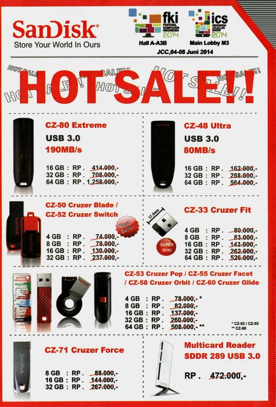 Butuh flash disk USB 3.0 yang kecepatannya sampai 190MB/s, atau mungkin flash disk USB 2.0? Mungkin kamu juga pas perlu card reader? Mau yang bermerek SanDisk? Ada hot sale loh untuk flash disk SanDisk di ajang ICS (Indonesia Cellular Show) di Jakarta Convention Center (JCC). Ini dia brosurnya.