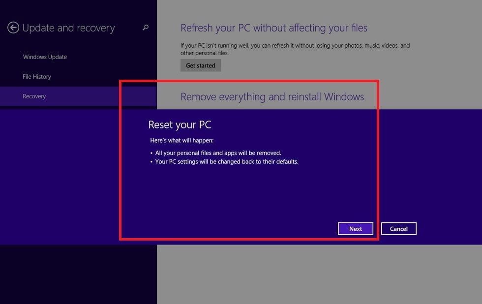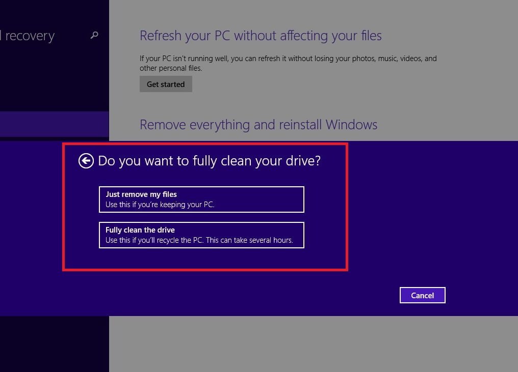 Klik Next, dan berikutnya kamu bisa memilih apakah ingin menghapus file saja (Just Remove My Files) atau memformat harddisk (Fully clean the drive). Pilihan kedua tentu saja memakan waktu yang lebih lama dibanding pilihan pertama. Selanjutnya akan tampil konfirmasi kembali untuk melakukan reset Windows 8/8.1. Sistem akan melakukan proses instalasi ulang hingga selesai.