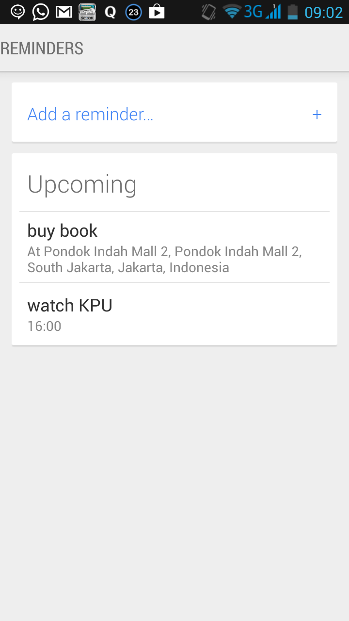 Contohnya jika kamu ingin diingatkan untuk menonton pengumumam KPU sore nanti, kamu tinggal ketikkan remind me di kolom search lalu klik Enter. Setelah itu akan muncul menu khusus untuk reminder, dan kamu tinggal mengetikkan apa yang ingin diingatkan dan kapan harus diingatkan. Selain waktu, kamu bisa juga mengeset berdasarkan lokasi. Contohnya kamu bisa mengetikkan remind me to buy book saat di Pondok Indah Mall.