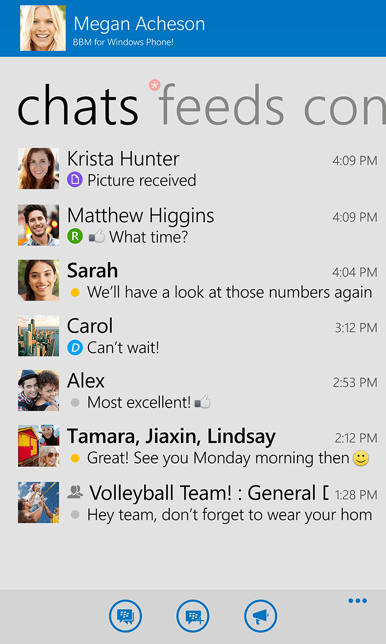 - BBM Feeds. Kamu bisa tahu update status terbaru dari sesama pengguna BBM pada daftar kontak mereka dengan BBM Feeds. Kamu juga bisa update statusmu.
