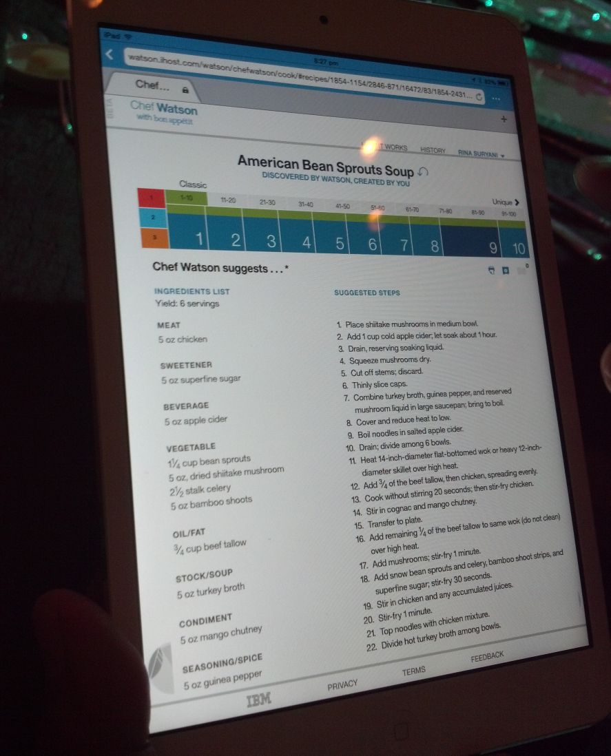 Dan itulah yang dilakukan Chef Cristie dari Marina Bay Sands Singapura dengan kolaborasi Chef (IBM) Watson. Untuk sekitar 400 tamu konferensi IBM Xcite 2014 yang hadir malam itu (14/10/2014) di Marina Bay Sands Expo Hall di Singapura, disajikanlah Turkish Bruschetta, Swiss Thai Asparagus Flan dan Seared Tilapin Fish Slider Pineapple Slaw sebagai apetizer (umpan tekak). Sebelumnya para undangan diajak bersulang dengan minuman racikan Chef Watson yang bernama Blue Carribean Hurricane. Kandungannya santan, rum, pisang, jus nanas, air jeruk limau dan pewarna biru serta Sprite.