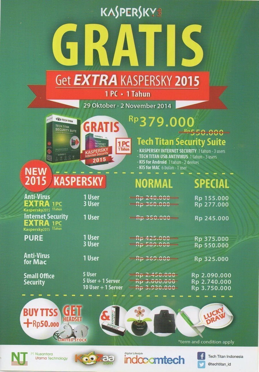 Kaspersky Bagi-bagi Bonus Indah PM, 31/10/2014 Jakarta, PCplus – Butuh pengaman untuk PC Anda? Antivirus asal Rusia, Kaspersky memberikan promo menarik selama Indocomtech 2014 berlangsung. Jangan lupa mampir ke booth Kaspersky. (Cakra/Indah)–klik gambar untuk memperbesar Indocomtech 2014 antivirusindocomtech 2014kaspersky