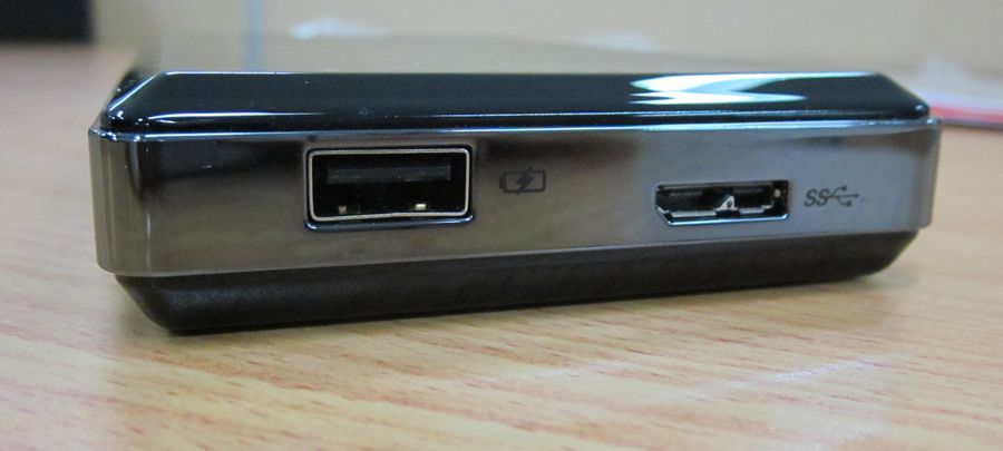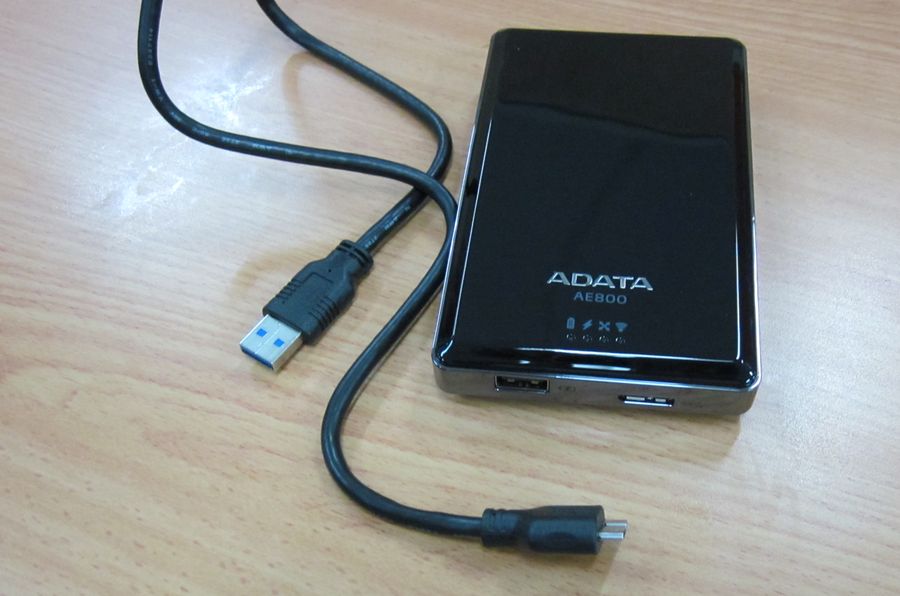 AE800 memamerkan dua port USB di sisi samping bawah badannya (di bawah logo ADATA). Port di sisi kiri bertindak sebagai port charging bagi perangkat mobile. Output-nya 1A atau 5W – memadai untuk rata-rata smartphone. Di sisi kanan ada port micro USB 3.0. Yang ini dipakai untuk menghubungkan drive ke sistem host agar berfungsi sebagai hard disk eksternal biasa. Port ini juga sekaligus dipakai untuk mengisi daya baterai di dalam AE800.
