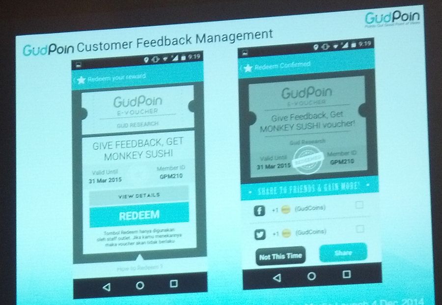 “Merchant dapat statistik yang bisa diekspor ke PDF atau Excel,” tambah Aswin tentang produk B2B-nya (business-to-business). O ya, konsumen yang mengisi kusioner dari GudPoin akan mendapatkan hadiah antara lain diskon dan e-voucher.