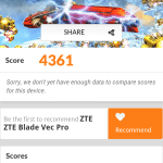 Dengan nilai itu, ZTE Blade Vec Pro berada di rata-rata smartphone octa core dengan prosesor MTK. Nilai ini juga mengartikan jika memainkan game Full HD, kamu kira-kira akan mendapatkan sekitar 18,5 frame per detik. Tak terlampau baik memang, namun sangat cukup untuk game-game Android saat ini.