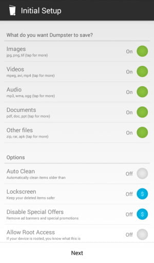 3. Di halaman setup awal, pilih semua tipe file yang ingin kamu pertahankan jika dihapus dan tap tombol ‘Next’.