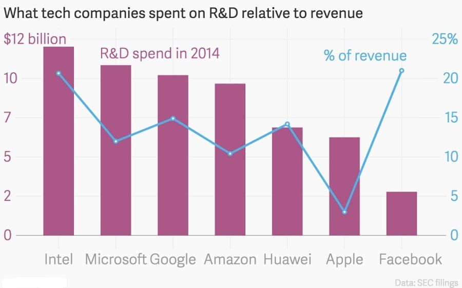Huawei memang tak segan-segan mengucurkan dana untuk R&D. Anggaran R&D-nya untuk tahun 2014 bahkan mengalahkan milik Apple, Oracle dan Facebook. Secara keseluruhan, Huawei menghabiskan 14,2% dari total pendapatannya untuk R&D. Angka ini juga lebih tinggi dibandingkan Microsoft (12%) atau Amazon (10,4%).