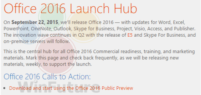 JAKARTA, PCplus – Kabarnya, Microsoft Office 2016 for Windows akan meluncur pada 22 September mendatang. Situs Jerman Winfuture sudah memiliki tampilan layar (screenshot) dari apa yang sepertinya merupakan tanggal konfirmasi, bersama dengan “calls to action” untuk sebuah hub terpusat bagi semua bahan pemasaran, pelatihan dan kesiapan Office 2016 Commercial. Rilis baru itu disebutkan memamerkan user interface baru yang warna-warni dan berkelas yang akan menandingi app Mac, Android dan iOS.