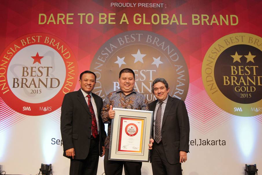 (ki-ka): Asto Sunu Subroto (Presiden Direktur Lembaga Survei MARS), Marselinus Tjhai (Marketing Manager of Canon Consumer System Product Div. PT. Datascrip) dan Kemal E. Gani (Group Chief Editor SWA) berfoto bersama saat penganugerahan Indonesia Best Brand Award (IBBA) 2015 di Jakarta (30/9/2015).