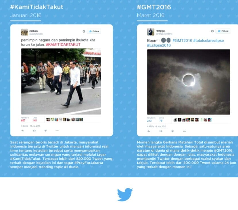 - Kami Tidak Takut, dengan 820 ribu kicauan saat terjadi serangan bom Thamrin (Januari 2016)