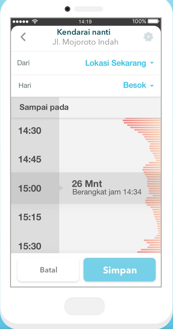 Nah, Waze akan memunculkan layar Planned Drives, menunjukkan jam-jam sibuk di sepanjang rute tujuanmu. Waze akan merekomendasikan waktu tepat untuk berangkat agar kamu tidak terlambat karena terhadang macet.
