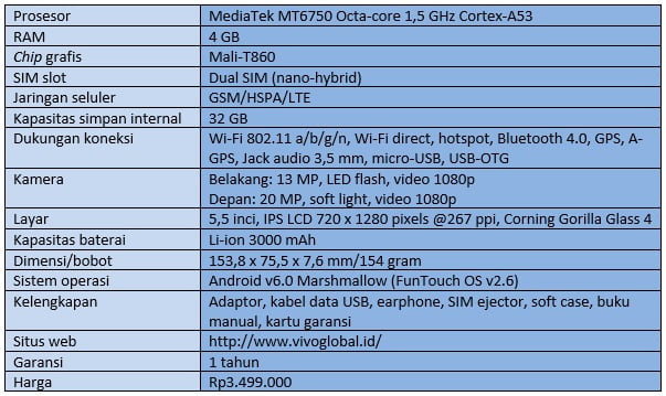Menyasar kelas menengah, Vivo V5 ditawarkan dengan spesifikasi sebagai berikut:
