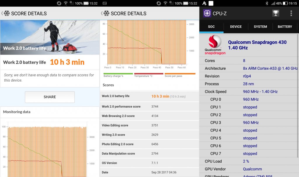 Prosesor Qualcomm Snapdragon 430 yang digunakan, yang bekerja pada kecepatan 960MHz sampai 1,4GHz tergantung load yang sedang diberikan, menawarkan efisiensi yang cukup baik. Terlihat, jika smartphone sedang dalam kondisi idle, ia akan mematikan sebagian besar core yang dimiliki. Dan core yang aktif pun akan bekerja pada kecepatan terendah.