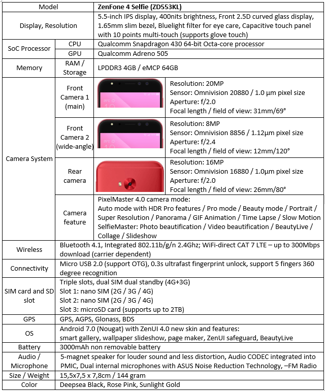 Sebelum membahas lebih lanjut, kita bahas sedikit spesifikasi teknis utama dari ASUS ZenFone 4 Selfie ZD553KL. Smartphone ini memiliki jeroan mesin antara lain, CPU Qualcomm Snapdrgon 430 octa-core up to 1.4GHz (8x ARM Cortex A53), GPU Qualcomm Adreno 505, RAM 4GB, storage 64GB, layar resolusi HD, sistem operasi Android 7.1.1 yang dilapisi oleh user interface atau sistem antarmuka ZenUI 4.0. Berikut ini spesifikasi lengkapnya: