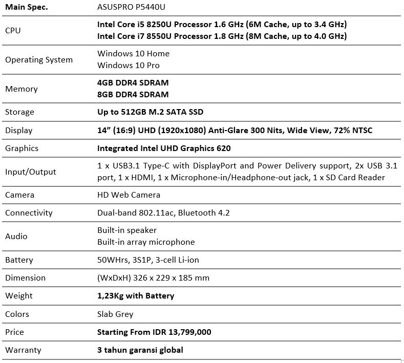 Permasalahan tersebutlah yang ingin dijawab oleh ASUSPRO P5440U. Laptop dari ASUS yang dirancang khusus untuk keperluan profesional dan bisnis ini hadir dengan bodi yang cukup ramping dan ringan, sehingga mudah dibawa bepergian. Satu lagi yang tidak kalah penting adalah laptop ini sudah dilengkapi dengan berbagai fitur khusus untuk memudahkan dan memberikan produktivitas lebih kepada para penggunanya yang merupakan pebisnis atau profesional dengan kegiatan padat dan sering bekerja secara mobile.