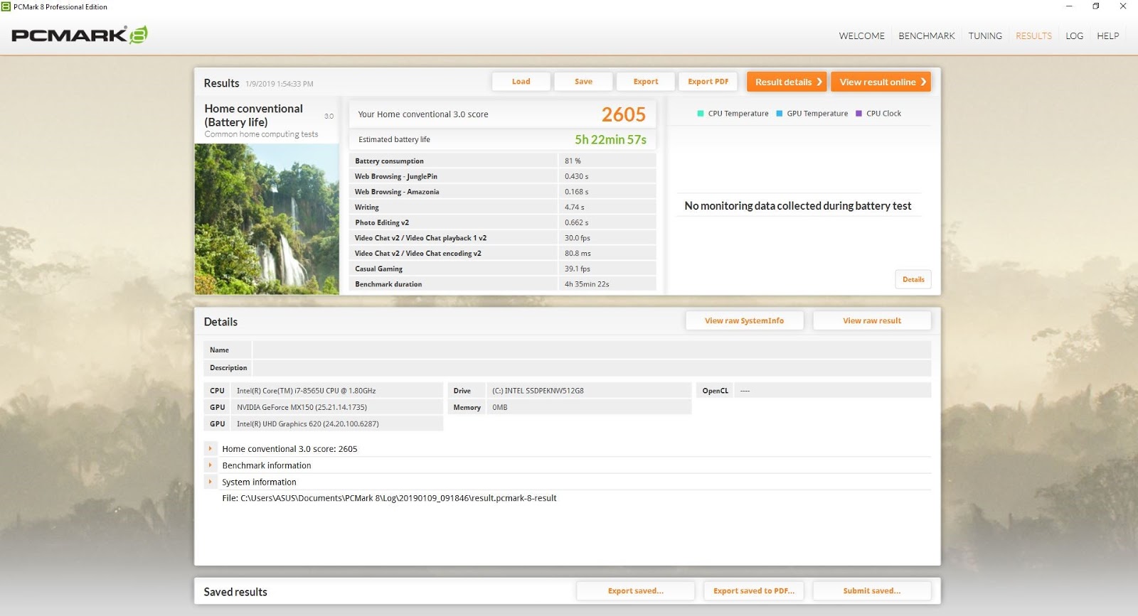 Sebagai laptop yang dirancang khusus untuk dibawa bepergian, ASUSPRO P5440U hadir dengan baterai andal yang bisa bertahan cukup lama. Berdasarkan pengujian menggunakan PCMark 8, laptop ini dapat bertahan selama kurang lebih 5,5 jam dengan kondisi WiFi aktif, mode battery life, dan tingkat kecerahan layar 50%.
