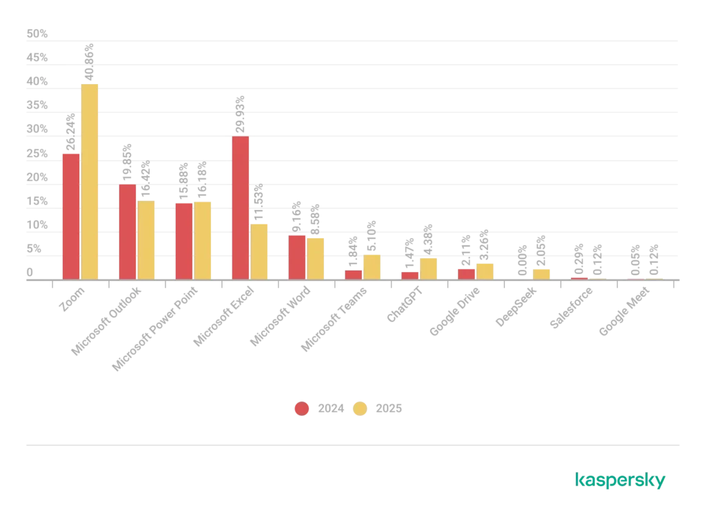 Menurut laporan Kaspersky, lebih dari 4.000 file berbahaya telah ditemukan menyamar sebagai 12 aplikasi daring yang umum digunakan oleh UMKM. Dari jumlah tersebut, hampir 41% meniru Zoom, menjadikannya aplikasi yang paling sering dipalsukan. Microsoft Office juga tidak luput dari sasaran, dengan Outlook dan PowerPoint masing-masing menyumbang 16% dari total file palsu.