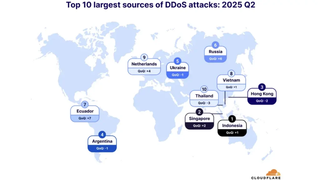 Jakarta, PCplus – Serangan DDoS Indonesia makin menggila. Menurut laporan Cloudflare kuartal II 2025, Indonesia menempati posisi pertama sebagai sumber utama serangan DDoS global. Serangan ini berasal dari node botnet, proksi, dan titik akhir VPN yang berlokasi di Indonesia.