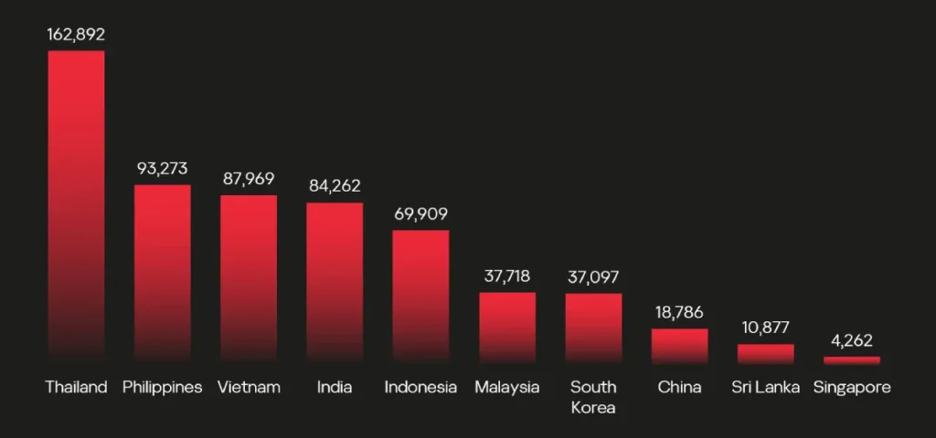 Wilayah Asia Pasifik menjadi pusat kebocoran terbesar. Thailand mencatat 163.000 kredensial Steam yang bocor, diikuti Filipina dengan 93.000, Vietnam 88.000, dan Indonesia hampir 70.000. Negara dengan jumlah terendah adalah Singapura, Sri Lanka, dan Tiongkok.