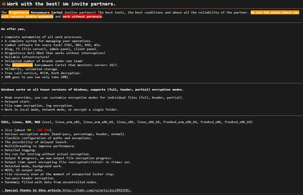 DragonForce tidak hanya memperkuat afiliasi, tetapi juga melakukan serangan terhadap pesaing. Mereka pernah mendeface situs kebocoran BlackLock dan mencoba mengambil alih infrastruktur RansomHub. Langkah ini menunjukkan ambisi DragonForce untuk menjadi pemain dominan dalam lanskap ransomware global.