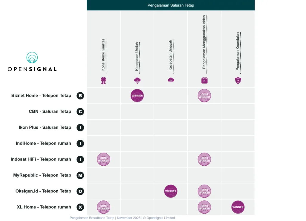 Jakarta, PCplus – Laporan pengalaman internet November 2025 dari Opensignal telah dirilis untuk pasar Indonesia. Analisis dilakukan pada periode 2 Agustus hingga 29 Oktober 2025. XL Home dinyatakan sebagai penyedia paling andal dengan skor 463 poin.