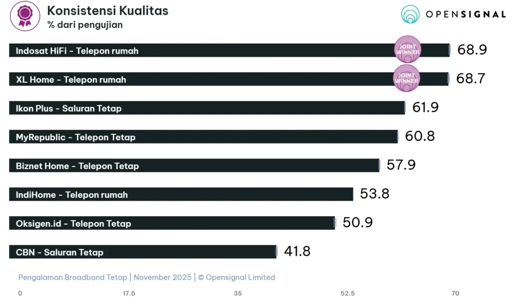 Nilai konsistensi mencapai 68,7 hingga 68,9 persen dari seluruh pengujian. Biznet mendominasi wilayah Jakarta dan Jawa dengan kemenangan di beberapa kategori. XL Home berhasil menyapu bersih penghargaan di Kalimantan, termasuk kecepatan dan keandalan. Di Sulawesi, XL Home juga meraih empat penghargaan penting. Indosat HiFi menunjukkan kekuatan di Sumatra dengan konsistensi kualitas tinggi.